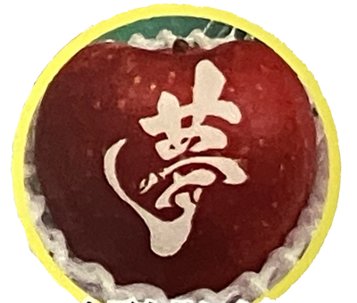 人気の文字入りりんご「夢1個入ります。(絵文字は数量限定)